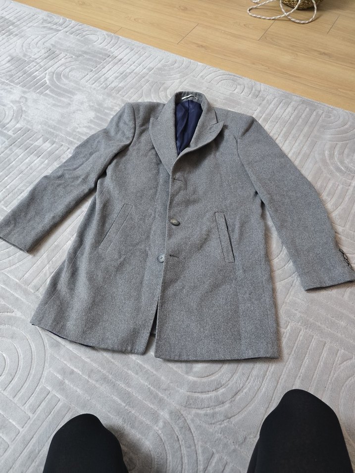 Düğmeli, gri erkek ceket, normal boyda ve uzun kolludur. Notch yaka ve düz dokuda, iş ortamına uygundur. Yumuşak ve sıcak kumaştan üretilmiştir. bedeni yazmıyor ancak 54 beden tahminim .ölçüleri iki kolalti 57 cm boyu 82cm