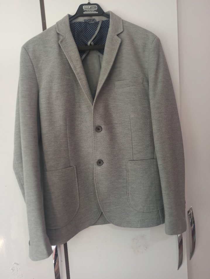 Gri renk, düğmeli, notched lapel yakalı erkek ceketi. Sentetik kumaştan, normal uzunlukta ve uzun kolludur. Ofis ve sokak stili için uygundur.