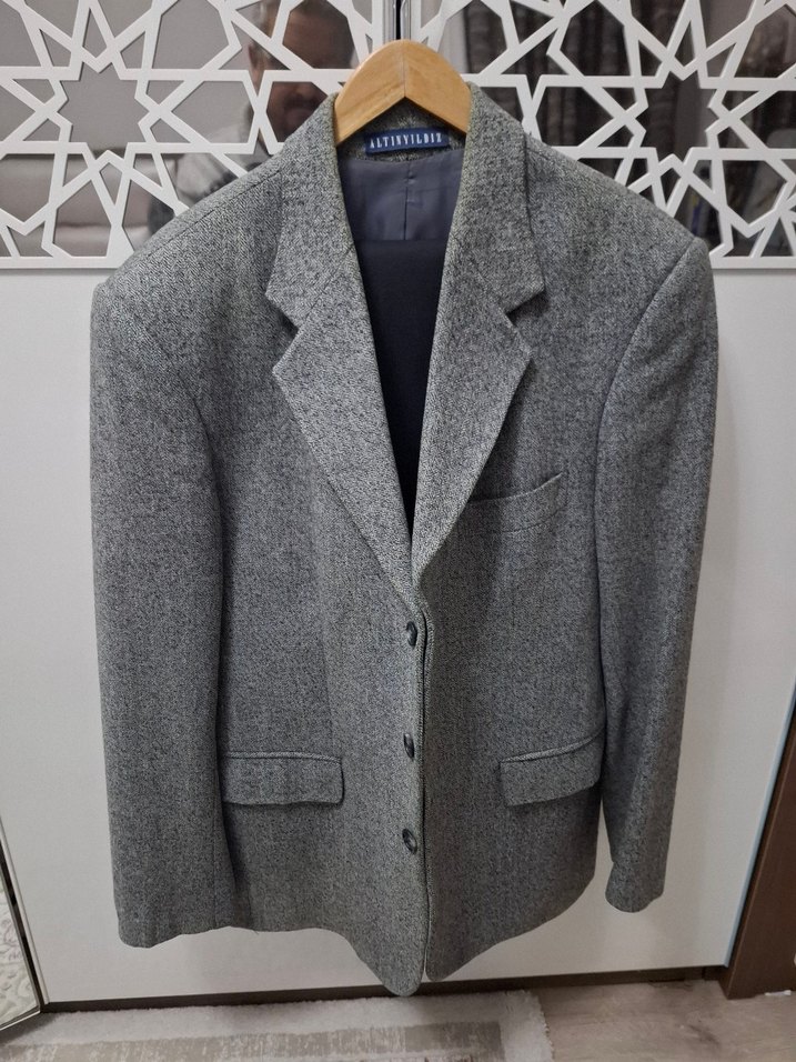 Gri renkli, düz desenli erkek ceket; klasik yaka, düğmeli ve normal kesimdir. Uzun kollu ve ofis ile günlük kullanıma uygundur. Kalın yün kumaş kışlık.