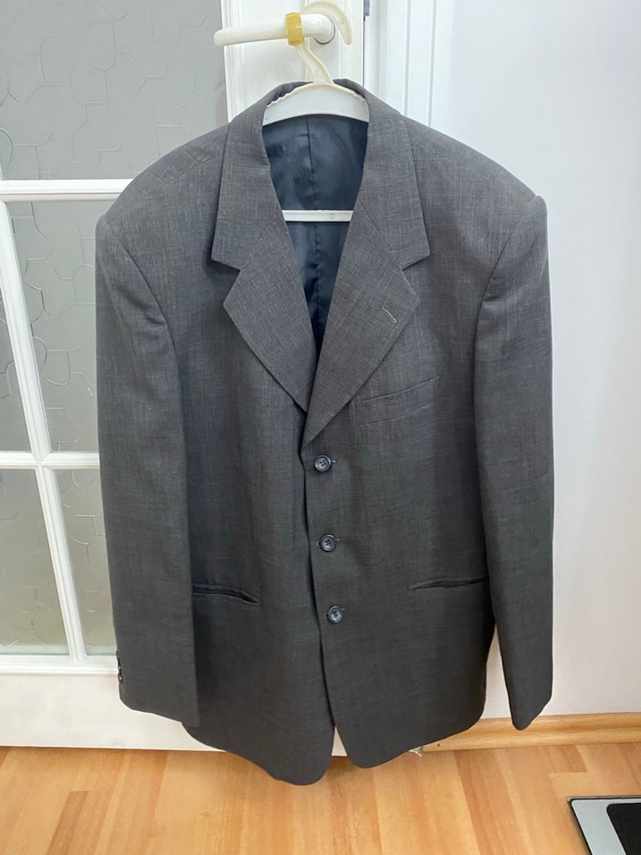 Düğmeli, gri renkte, normal boyda ve düz kesim erkek takım ceketi. Uzun kollu ve klasik ofis stili için uygundur. ️