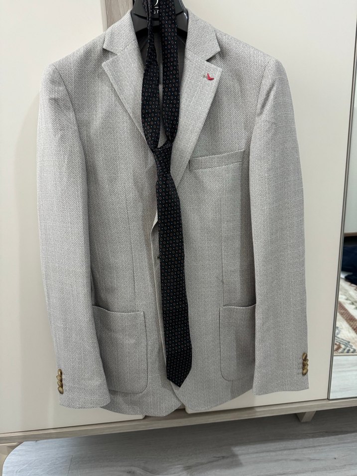 Gri renkli, düğmeli ön cep ve klasik kesime sahip erkek takım elbisesi. Uzun kollu ve ofis için uygun sade tasarım.D’S DAMAT