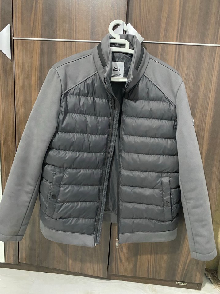 Gri renk, yüksek yakalı, uzun kollu ve fermuarlı erkek mont. Kapitone ve yumuşak kumaş panellerle günlük street wear tarzında. Yaka kısmında ufak sigara yanığı var harici hatasız