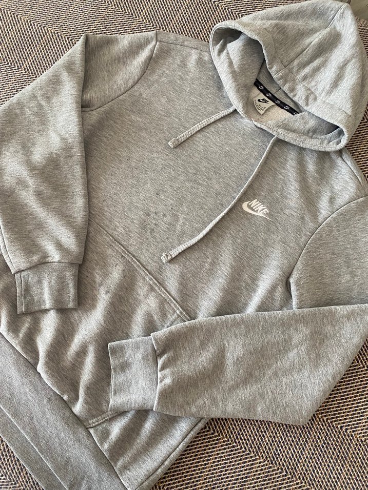 Gri renkli, bol kesim erkek sweatshirt, bisiklet yaka ve uzun kolludur. Fermuarlı, yumuşak ve sıcak kumaştan üretilmiştir, günlük kullanım için uygundur. Nike logosu göğüste yer alır.