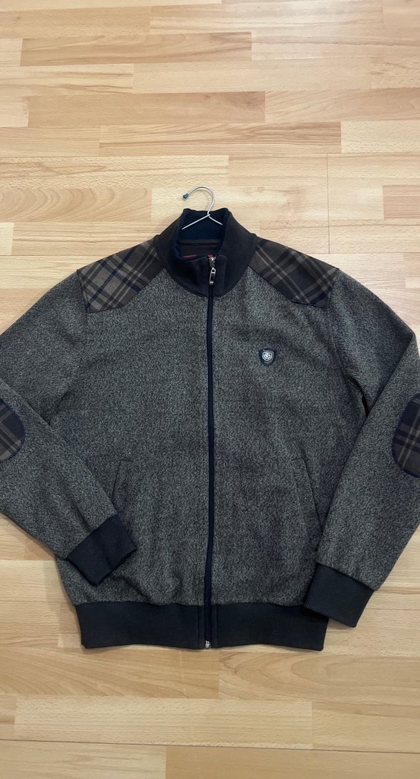 Gri renkli, fermuarlı, omuz ve dirseklerde ekose detaylı, rahat kesim erkek sweatshirt. Yumuşacık dokusu,yepyeni,kahve tonlarındadır