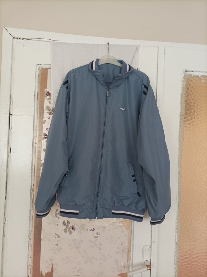 Gri renkli, fermuarlı ve yüksek yakalı bu erkek yağmurluğu, sentetik kumaştan üretilmiş, rahat kesim ve uzun kolludur.