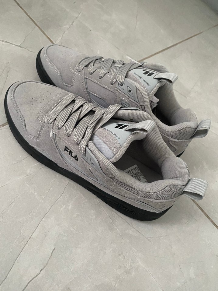 Gri renkli, bağcıklı ve düz tabanlı Fila erkek spor ayakkabısı, rahat ve şık sokak stili için uygundur.
