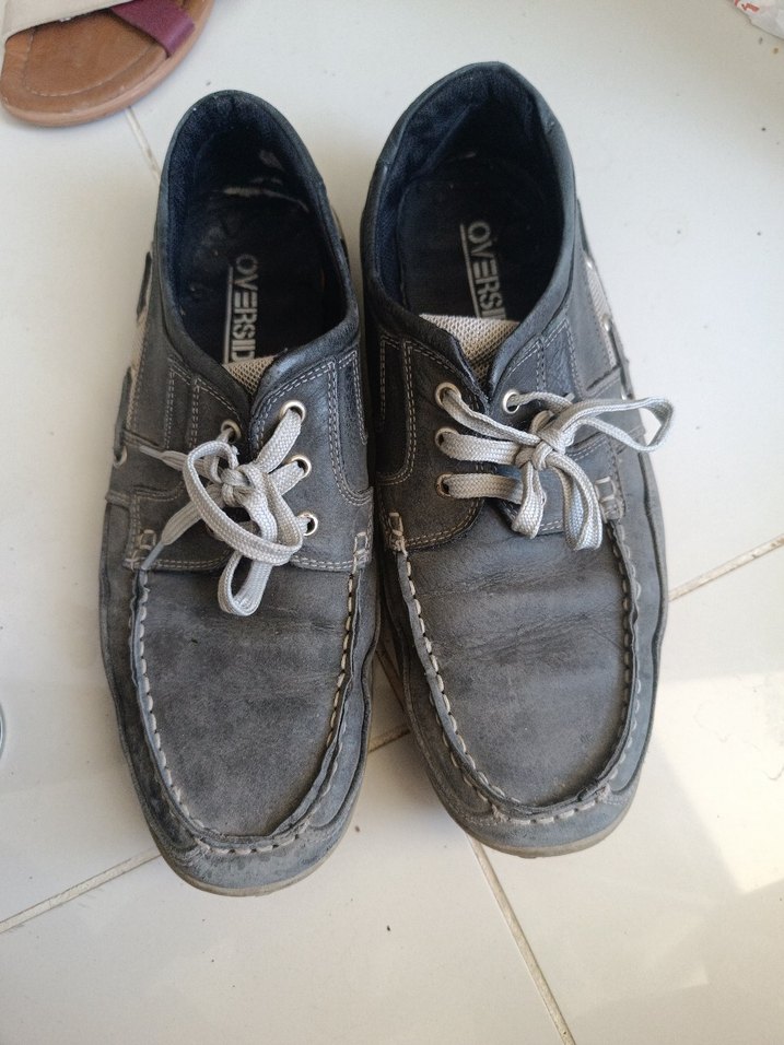 Gri bağcıklı, günlük sokak stili erkek ayakkabısı, yumuşak ve kullanılmış malzemeden yapılmıştır.