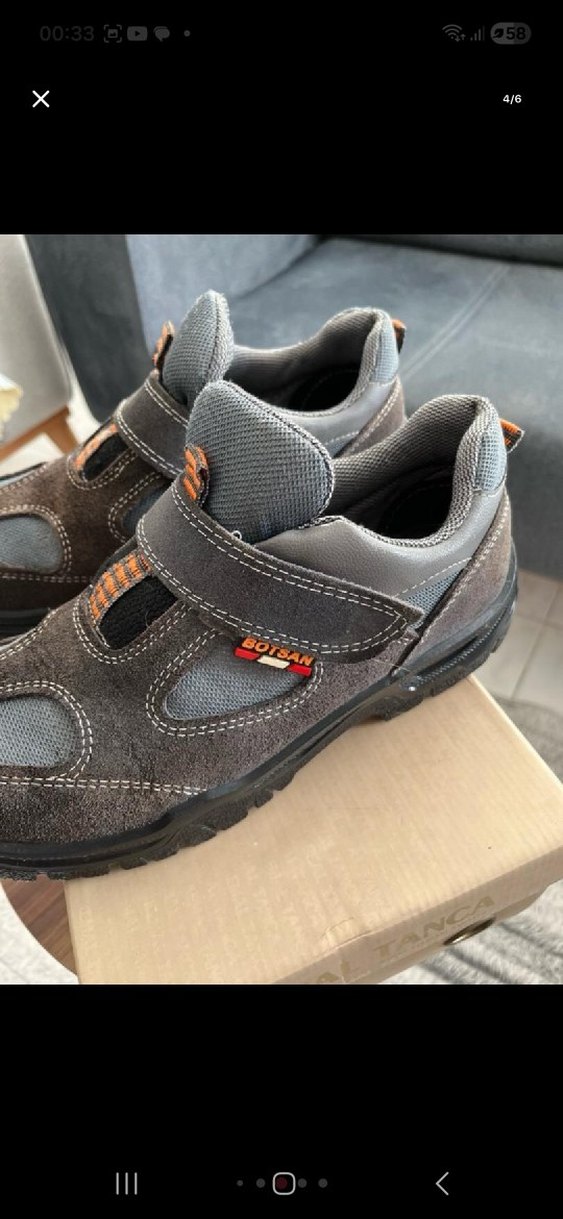 Gri renkli, baskılı desenli erkek outdoor ayakkabısı, kaymaz kauçuk taban ve kolay kullanımlı Velcro bant içerir.