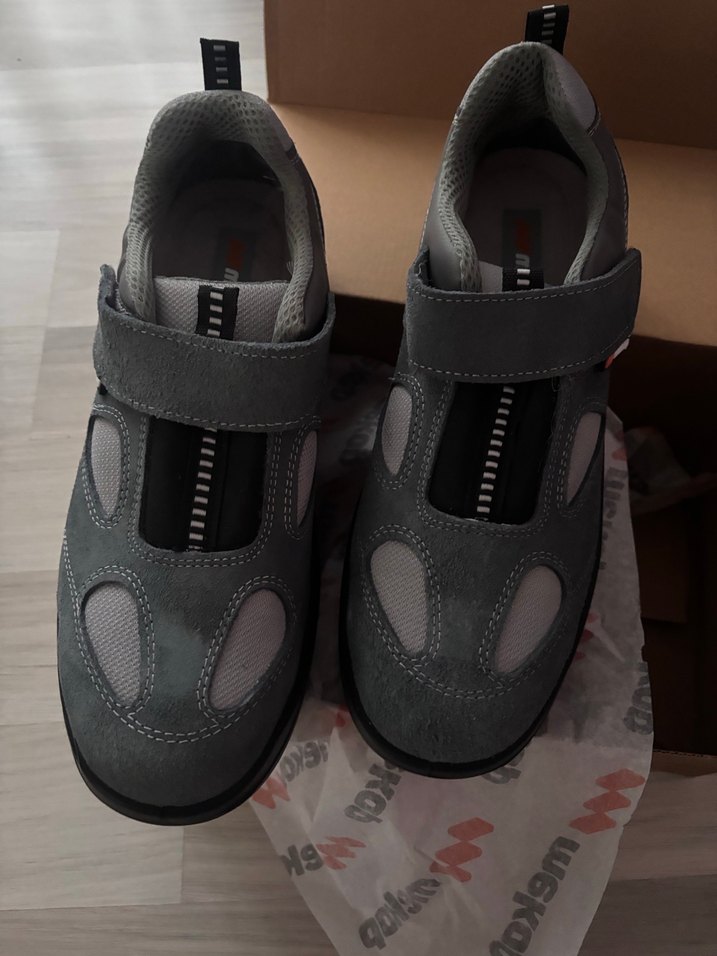 Gri renkli çelik burunlu iş ayakkabısı 44 numaradır. Kullanılmamıştır.