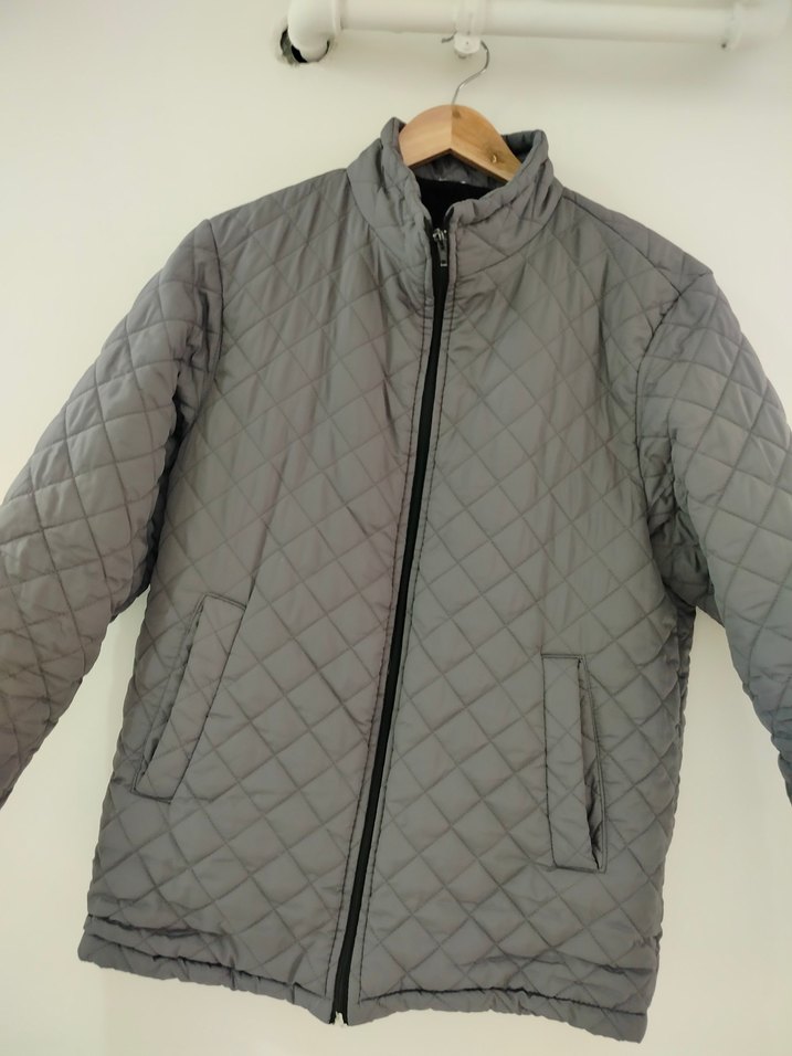 Gri renkli, kapitone desenli erkek mont fermuarlı ve uzun kolludur. Sentetik kumaştan üretilmiş, normal kesim ve minimalist tarzdadır.