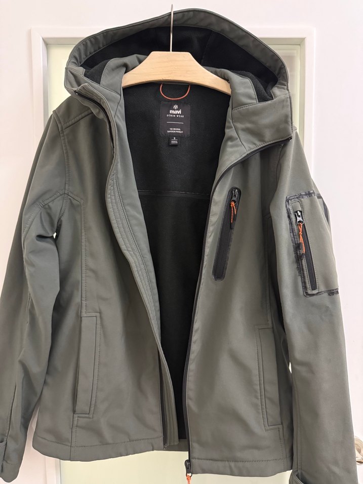 Gri renkte, kapüşonlu ve fermuarlı ceplere sahip erkek mont. Yumuşak fleece kumaştan, uzun kollu ve normal midi boyda, şık ve günlük kullanıma uygun. Sadece kol kısımdaki fermuar etrafında hafif soyulma mevcut.