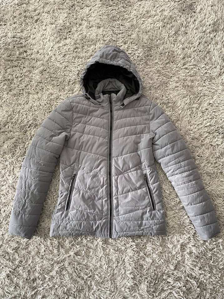 Gri renkte, kapüşonlu erkek kış montu. Yumuşak ve sıcak fleece kumaştan, uzun kollu ve midi boyda, günlük kullanım için uygun.