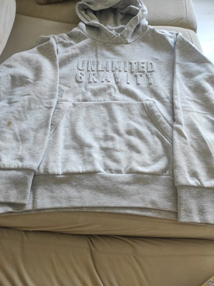 Gri renk, yuvarlak yakalı ve uzun kollu erkek sweatshirtü. Yumuşak ve sıcak kumaştan, bol kesim ve önünde kabartma yazı ile sokak stili için uygun.az kullanıldı hiç bir defosu yoktur.sadece kolunda leke var