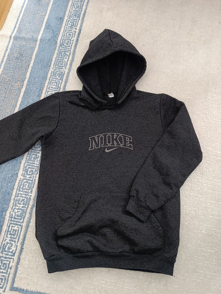 Gri renkli NIKE sweatshirt, bol kesim, uzun kollu ve yuvarlak yakalıdır. Yumuşak kumaştan yapılmış, baskılı örgü logo ve ön cep içerir, günlük kullanım için uygundur.