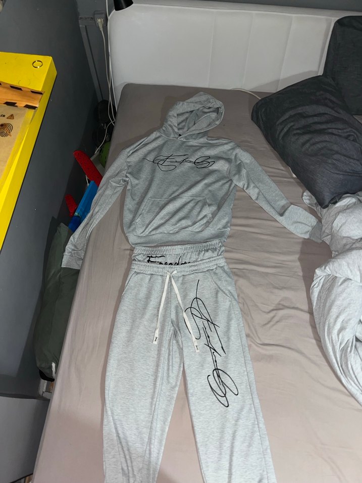 Gri renk, kapüşonlu, fermuarlı ve uzun kollu üst ile baskılı, midi boy rahat kesim eşofman altından oluşan erkek takımı. Yumuşak kumaştan üretilmiştir, dış mekan kullanımı için uygundur.