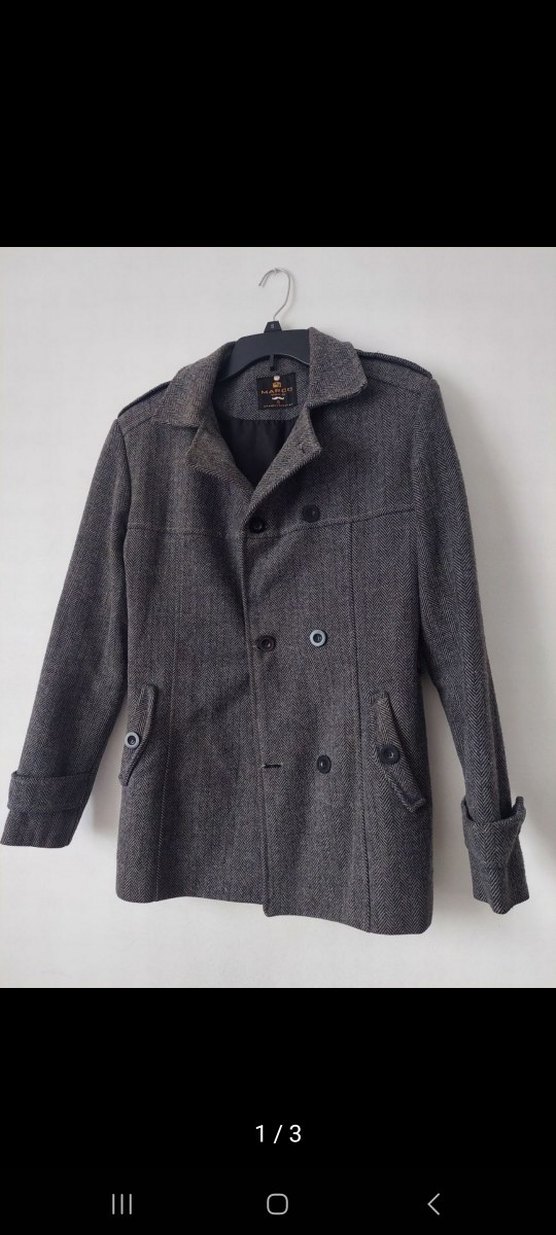 Gri erkek kaşe kaban, kesik yakalı ve düğmeli ön ceplidir. Normal kesim, uzun kollu ve midi boyda, günlük kullanım için uygundur.