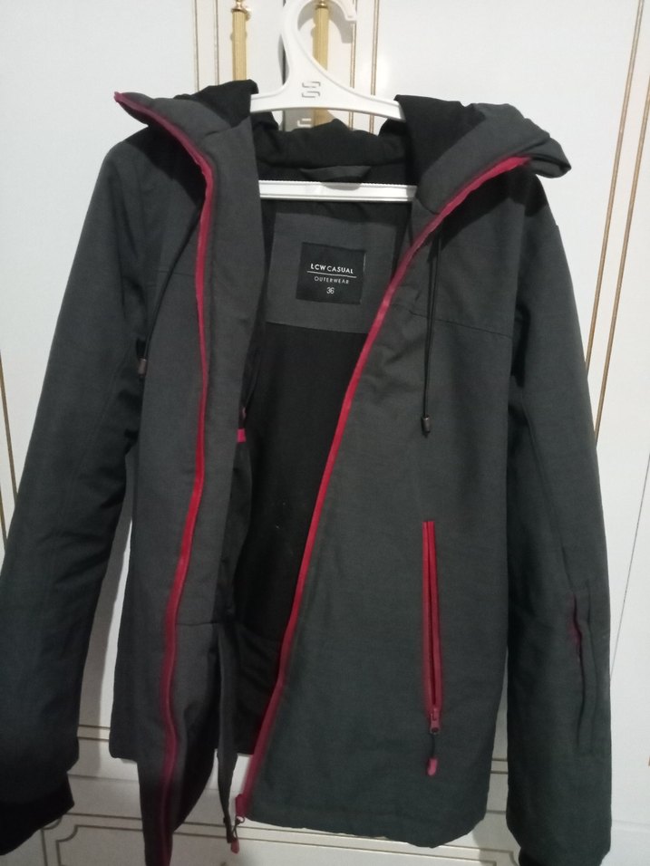 Gri renkte, fermuarlı cepleri ve yüksek yakası olan erkek kayak montu. Yumuşak, sıcak kumaştan yapılmış, dış mekan ve günlük sokak giyimine uygun.