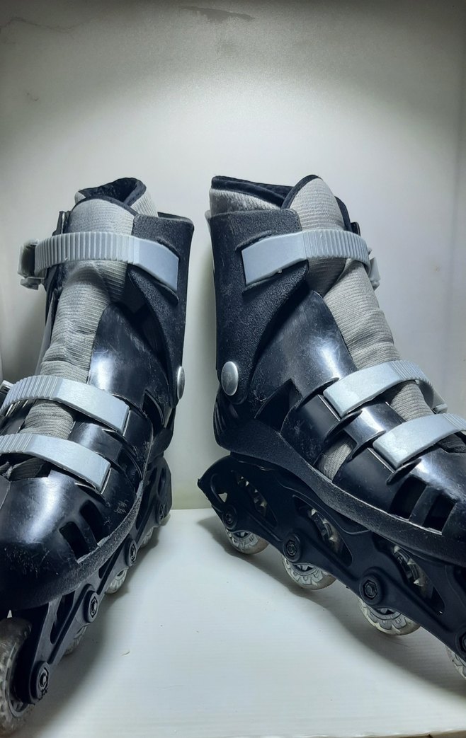 Gri renkte, tokalı kaykay patenleri, spor için tasarlanmış biker tarzında, kauçuk tabanlı ve desensiz.