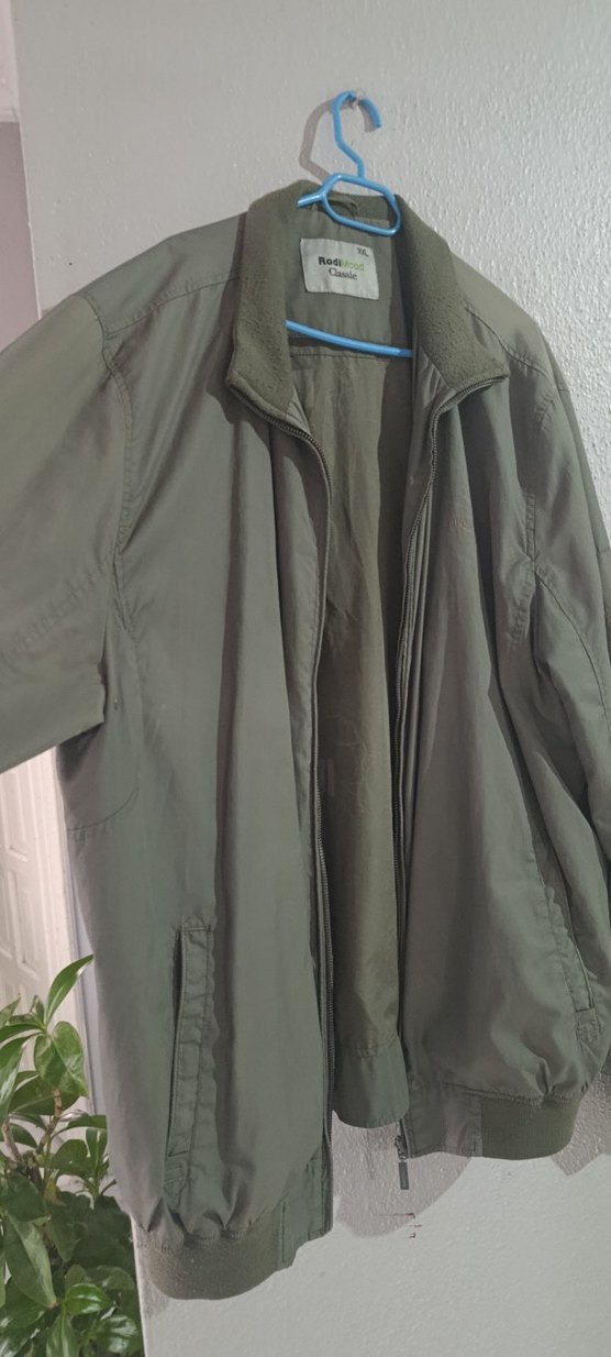 Gri keten erkek ceket, fermuarlı ve rahat kesimdir. Uzun kollu, deseniz ve midi boyda, günlük sokak stiline uygundur.