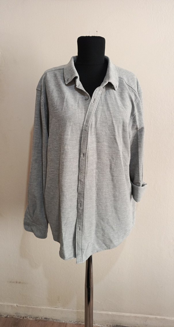 Gri keten kumaştan, düğmeli ve yakalı erkek gömleği. Uzun kollu, bol kesim ve midi boyda, günlük rahat kullanım için uygundur.
