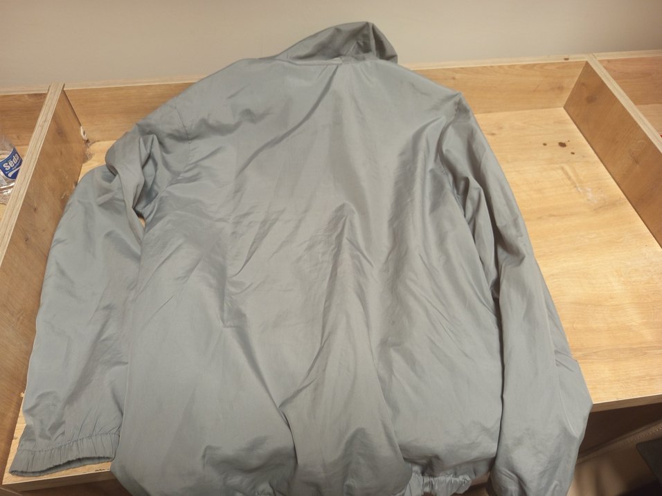 Gri keten kumaştan erkek yağmurluk, bol kesim ve drapeli tasarıma sahiptir. Bisiklet yaka ve uzun kolludur, minimalist sokak stiliyle dış mekan kullanımı için uygundur. ️