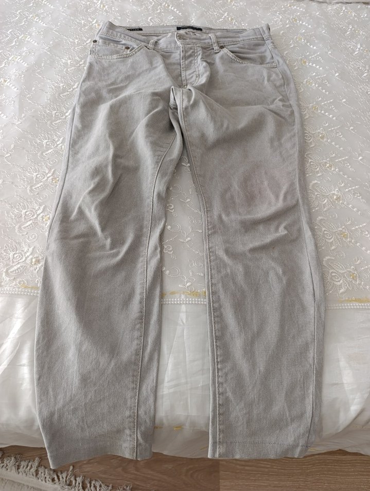 Gri renk, keten kumaştan, düğmeli ve normal boyda, rahat kesim erkek pantolon. Günlük kullanıma uygundur. ön kısmında resimde görünüyor minik bir leke ucu var
