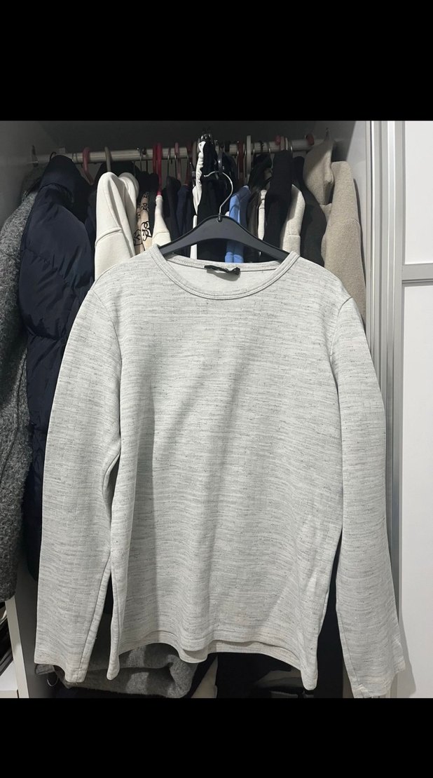 Gri renkte, keten kumaştan uzun kollu ve bisiklet yakalı erkek sweatshirt. Rahat kesimi ve normal boyu ile günlük sokak stiline uygundur.