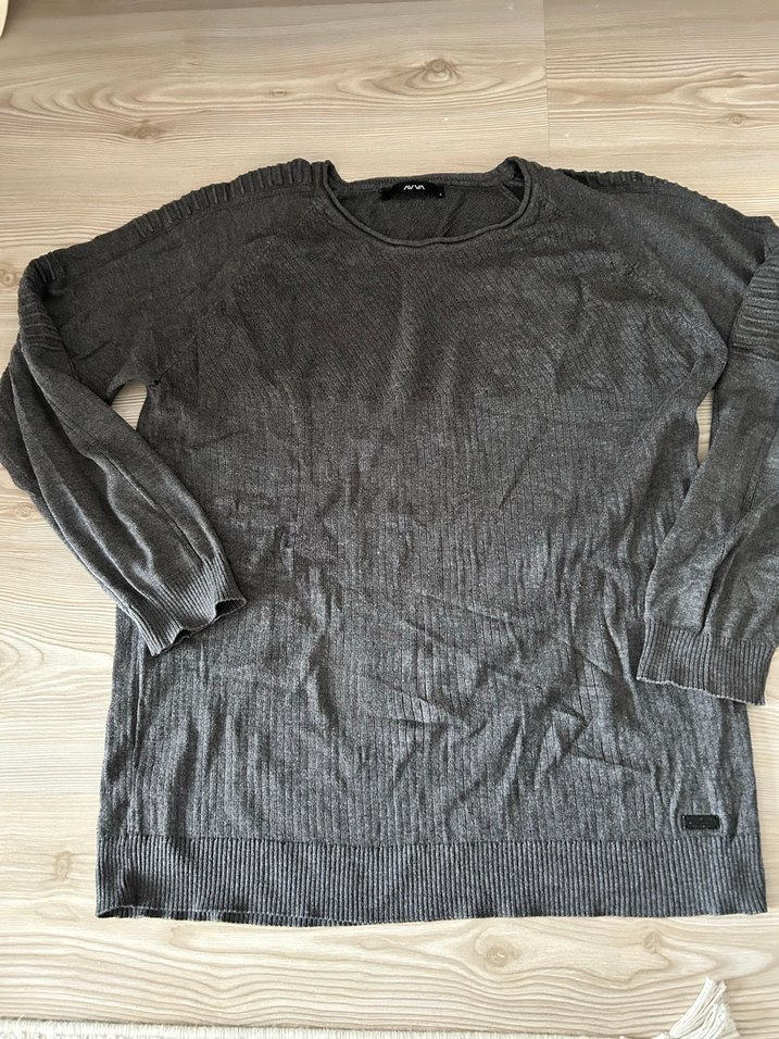 Gri renkli, keten kumaştan, yuvarlak yaka ve uzun kollu erkek triko kazak. Örme dokusu ve bol kesimiyle rahat bir kullanım sunar.