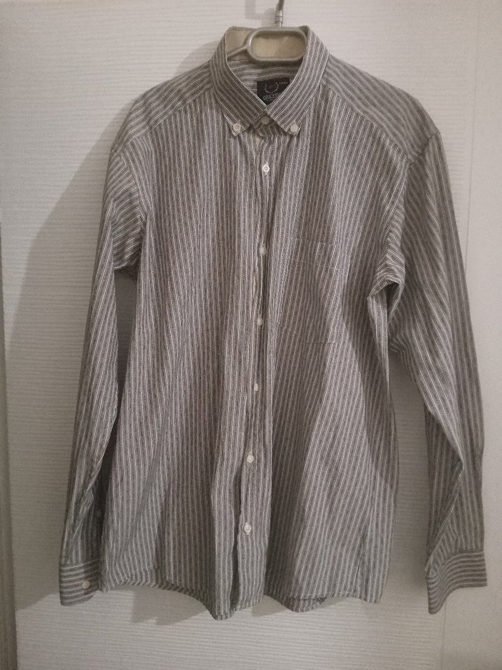 Gri tonlarında çizgili, keten pamuklu kumaştan yapılmış, uzun kollu ve düğmeli erkek gömleği. Normal midi boyda ve regular kesim, ofis için uygun casual tarzda. marka temsili