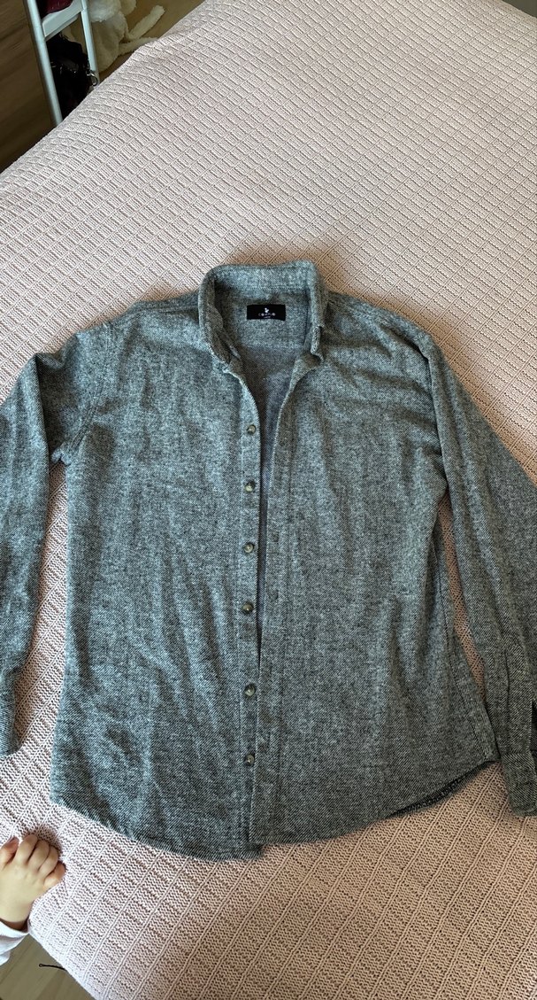 Gri keten uzun kollu erkek gömleği, düğmeli ve notlu yakalı, rahat kesimiyle günlük sokak stiline uygun.