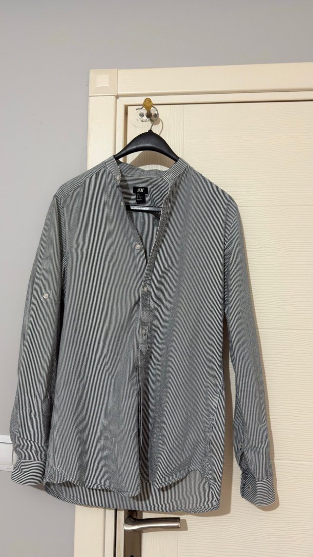 Gri keten kumaştan, uzun kollu, yakalı ve düğmeli erkek gömleği. Rahat kesimi ve günlük sokak stili için uygundur.