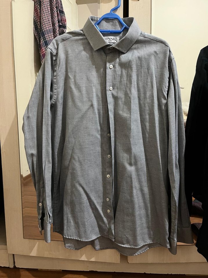 Gri renkli, keten kumaştan yapılmış, uzun kollu, yakalı ve düğmeli erkek gömleği. Normal boyda, regular fit kesimlidir, ofis ve günlük sokak stili için uygundur.