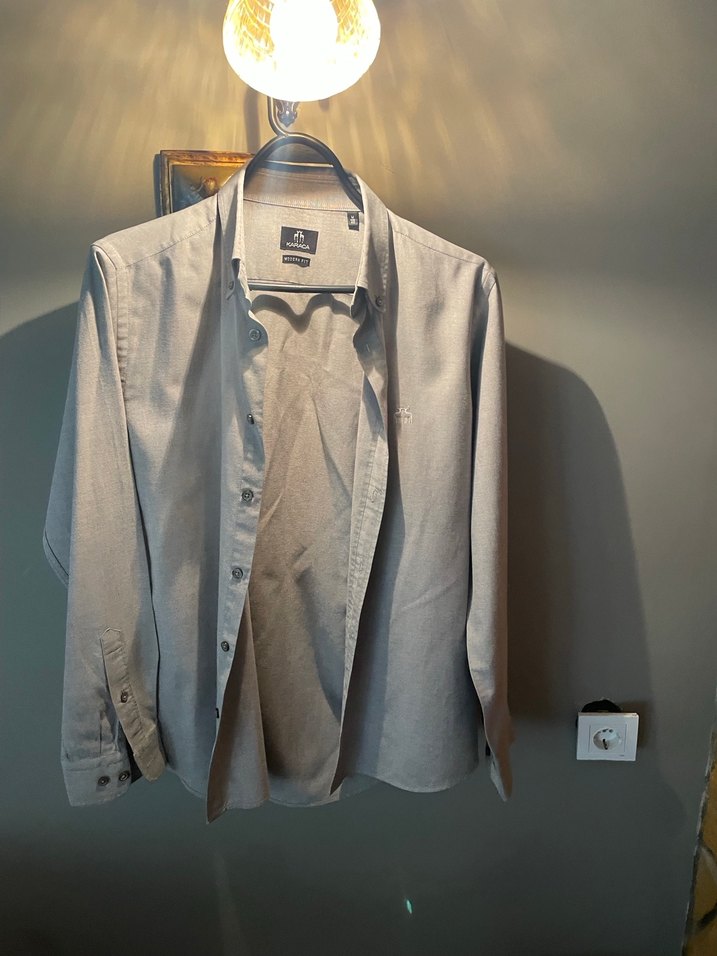 Gri renkte, keten kumaştan üretilmiş, düğmeli ve normal boyda erkek gömlek. Notlu yakası ve uzun kolları ile rahat bir kesime sahiptir.