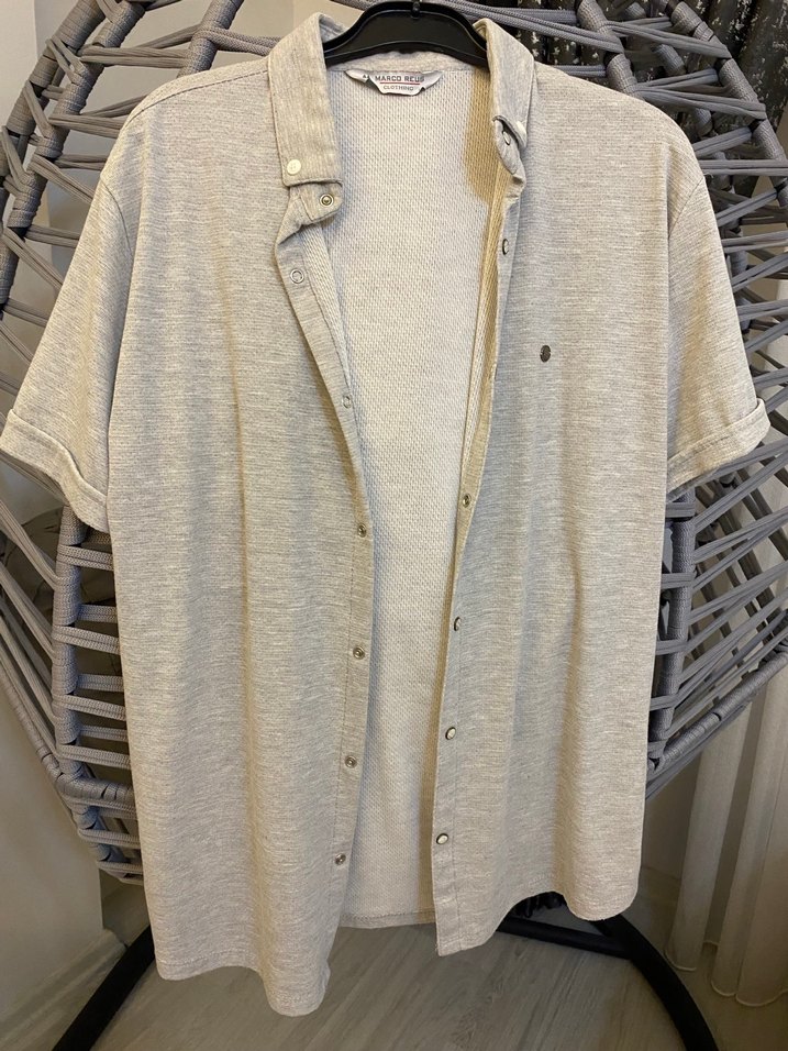 Gri erkek gömlek, kısa kollu ve çıtçıtlıdır. Notlu yaka ve rahat kesimiyle günlük sokak stiline uygundur.
