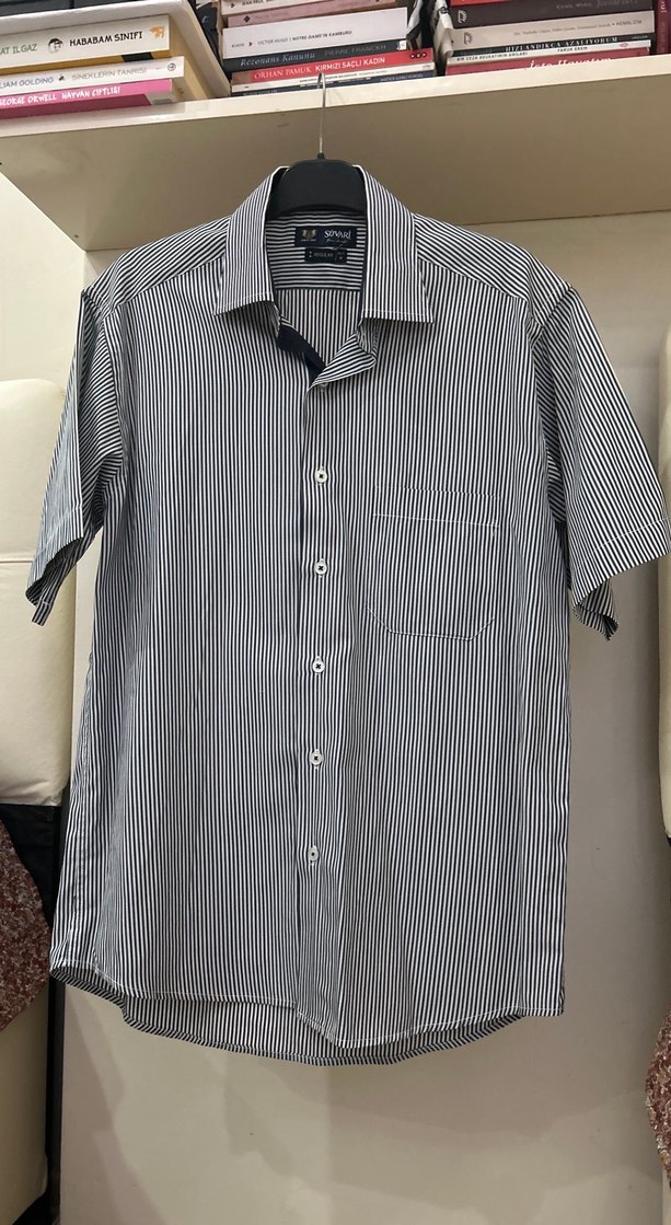 Bu gri erkek gömlek kısa kollu, regular fit ve yakalıdır. Düğmeli ön cep bulunur, sentetik kumaştan üretilmiştir ve ofis için uygundur. Yedek düğmeleri bulunur. Temiz kullanılmıştır. M bedendir. toplu alımlarda yardımcı olunur