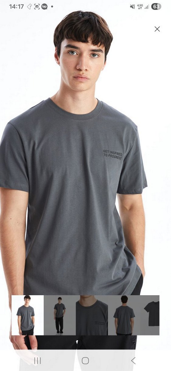 Gri renkli, yuvarlak yaka ve kısa kollu erkek tişörtü. Pamuktan üretilmiş, rahat ve bol kesim. Göğüste küçük yazı detayı bulunur.