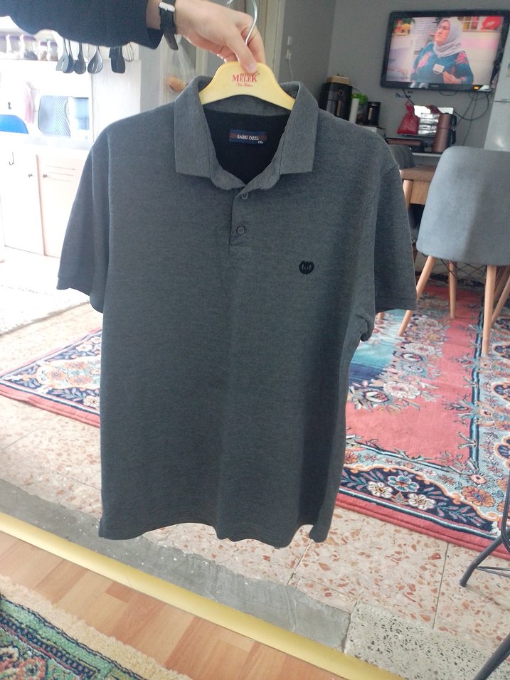 Gri renkte pamuklu erkek polo tişört, kısa kollu ve düğmeli yakaya sahip. Gevşek kesimi ve baskılı detayıyla günlük sokak stiline uygun.