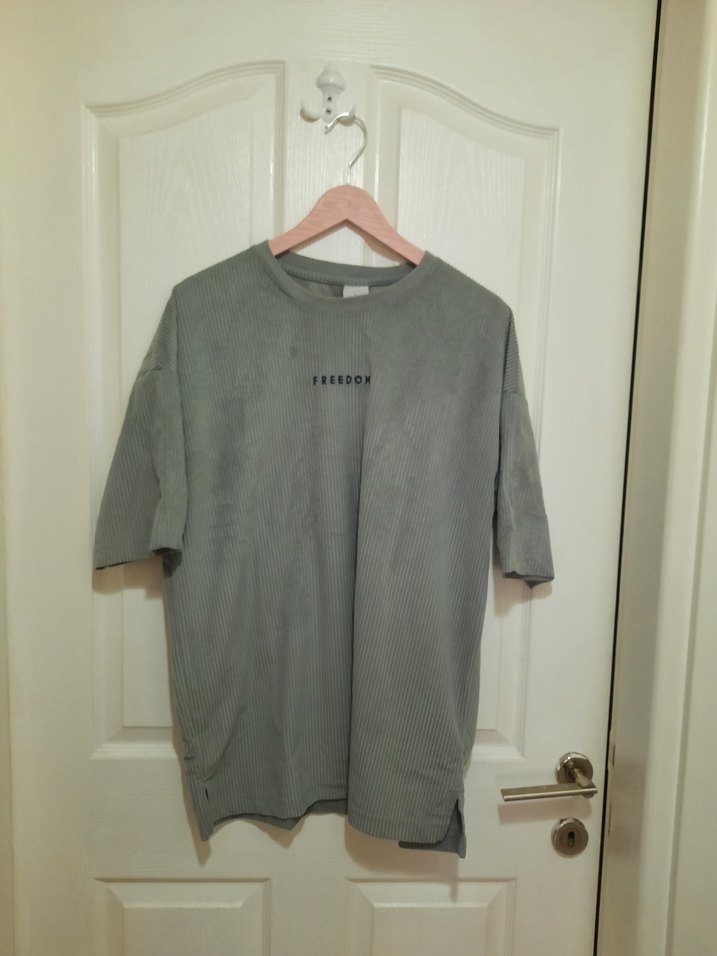 Gri renkli, kısa kollu ve yuvarlak yakalı erkek süet tişört. Önden "FREEDON" yazısı bulunur. Salaş kesim ve normal boydadır. Günlük kullanıma uygundur. L - XL uyumlu boy 75 cm iki kol arası 60 cm