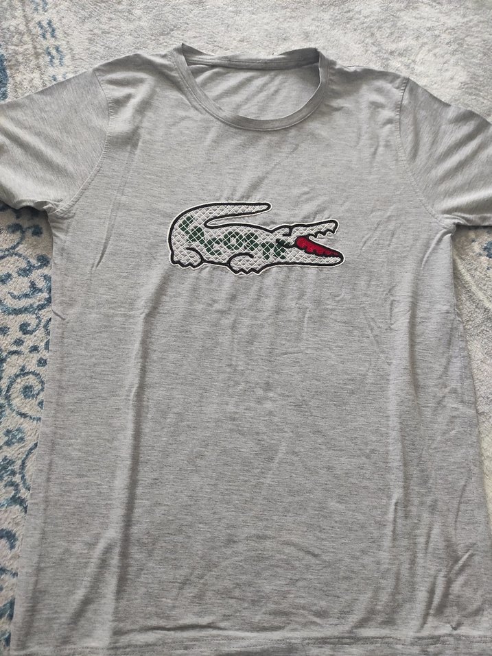 Gri pamuk erkek tişörtü, kısa kollu ve yuvarlak yakalı, bol kesim ve önünde timsah baskısı bulunur. Rahat ve günlük kullanım için uygundur.