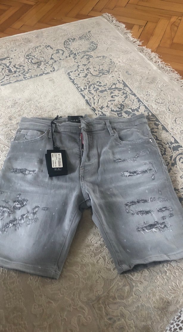 Gri renkli, bol kesim denim kısa paça şort, baskılı yıpranmış detaylara ve tokalı kapanışa sahiptir. Sokak stili için uygundur. Bel ölcüzü42 boy ölcüzü52 cm