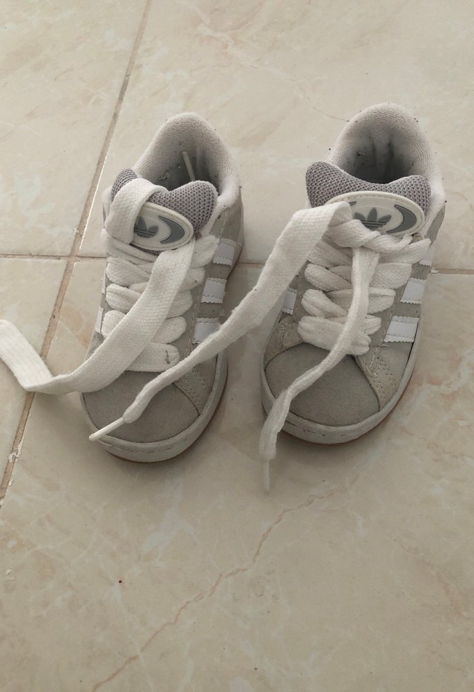 Gri renkli, adidas ipli ve kauçuk tabanlı erkek kız çocuk spor ayakkabısı. Desensiz, rahat sokak stili için uygun. Küçüldüğü için satışda