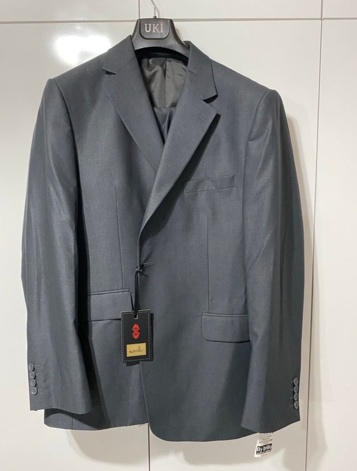 Gri renk, düğmeli önü ve klasik kesim yakası olan erkek takım elbisesi. Uzun kollu, desen içermeyen ve ofis için uygun klasik tasarım.
