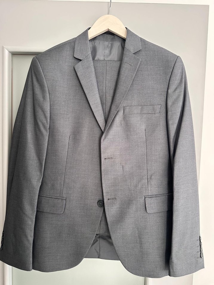 Gri renkte, düğmeli, klasik kesim ve modern klasik tarzda erkek takım elbise ceketi. Uzun kollu ve ofis kullanımı için uygundur. Sadece bir kere giyildi