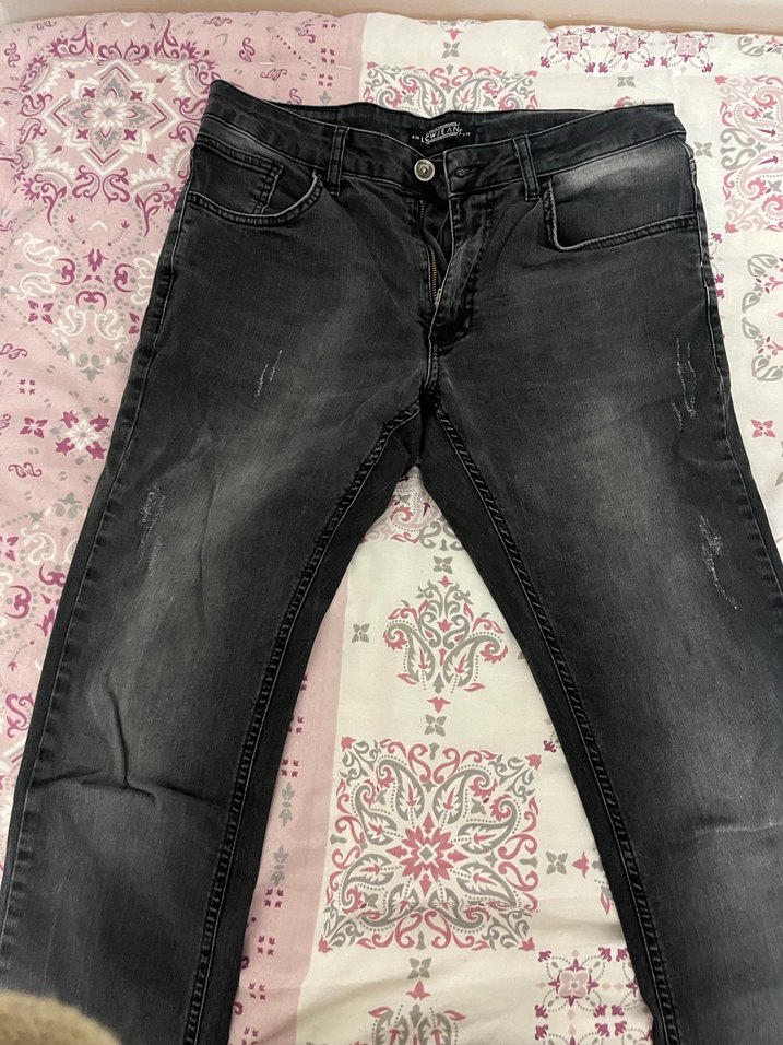 Gri denim kumaştan yapılan erkek kot pantolon. Normal boyda, günlük kullanıma uygun 32/32
