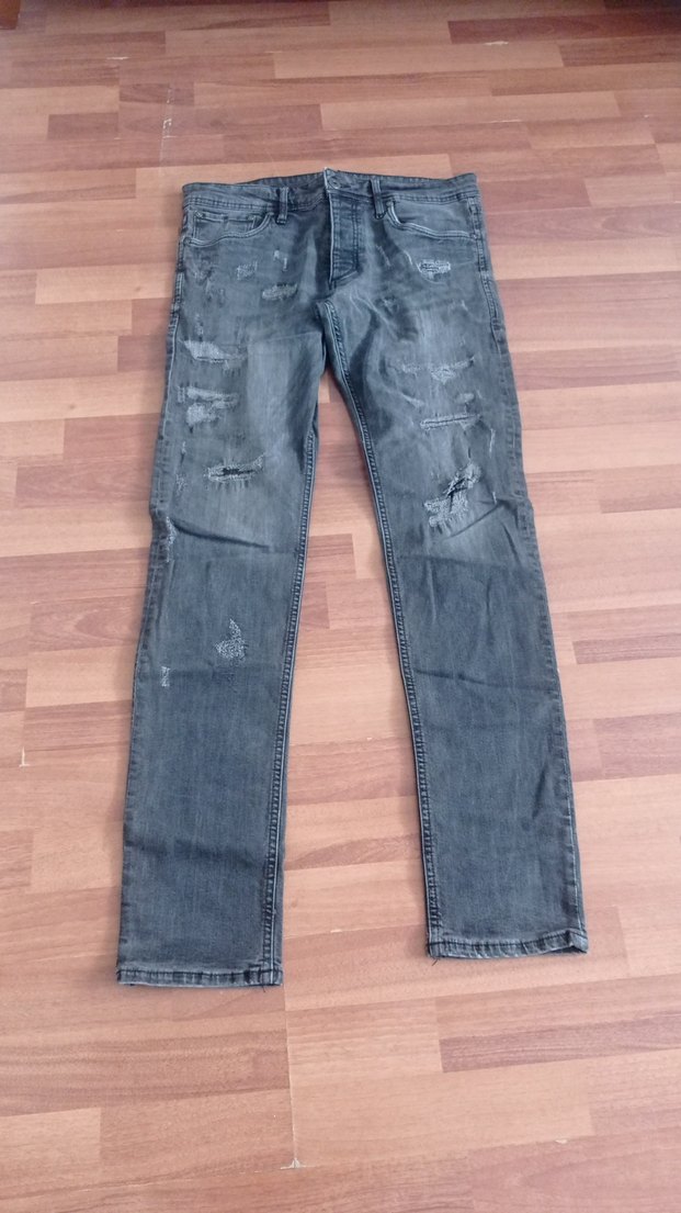 Gri renkli, rahat kesim ve tokalı detaylı erkek kot pantolon. Dayanıklı denim kumaştan, günlük sokak stiline uygun.