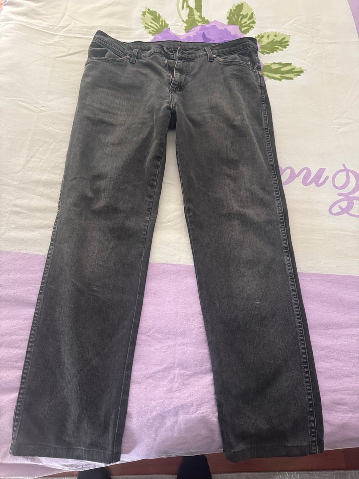 Gri renkli, kot kumaştan yapılmış pantolon. Düz ve tokalı detaylara sahip, rahat kesim, günlük ve sokak stili için uygun.