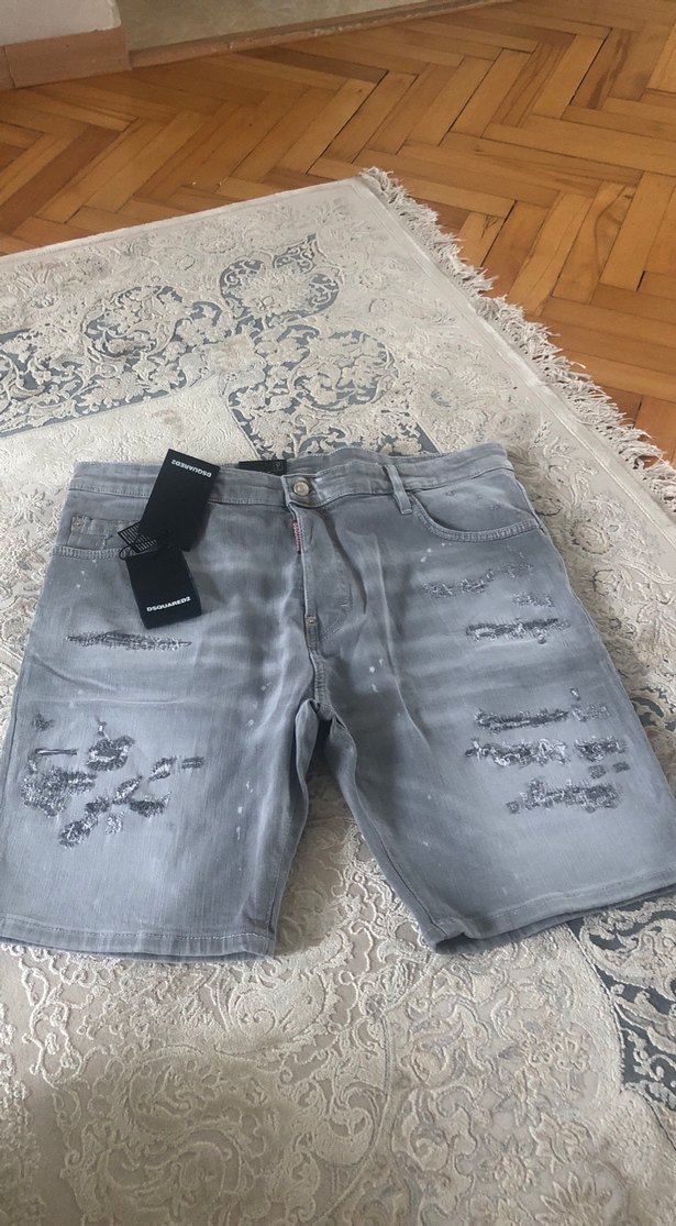 Gri renkte, bol kesim, kemerli erkek kot şort. Yıpratılmış detayları ile günlük rahat sokak stili için uygun.bel ölcüzü48 boy ölçüsü 52 cm