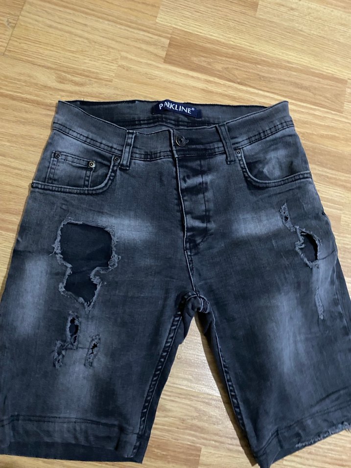 Gri renkli, gevşek kesim kot şort. Sokak stili ve yırtık detaylarıyla günlük kullanıma uygun rahat bir model.
