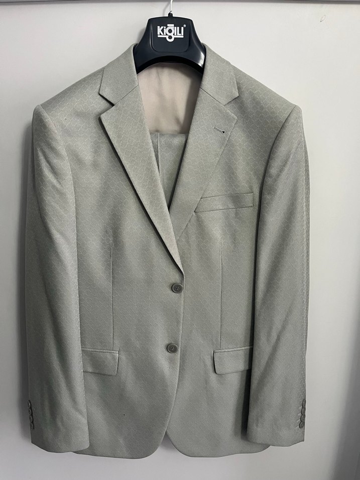 Gri renkli erkek takımı, kruvaze yaka, düğmeli ön ve uzun kollu tasarımıyla klasik ve modern bir görünüm sunar.