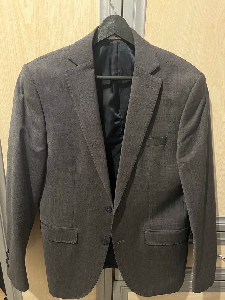 Gri renkli, düğmeli, notch yakalı ve uzun kollu erkek ceket. Normal kesim ve desensiz, ofis kullanımı için uygun klasik tarzda.